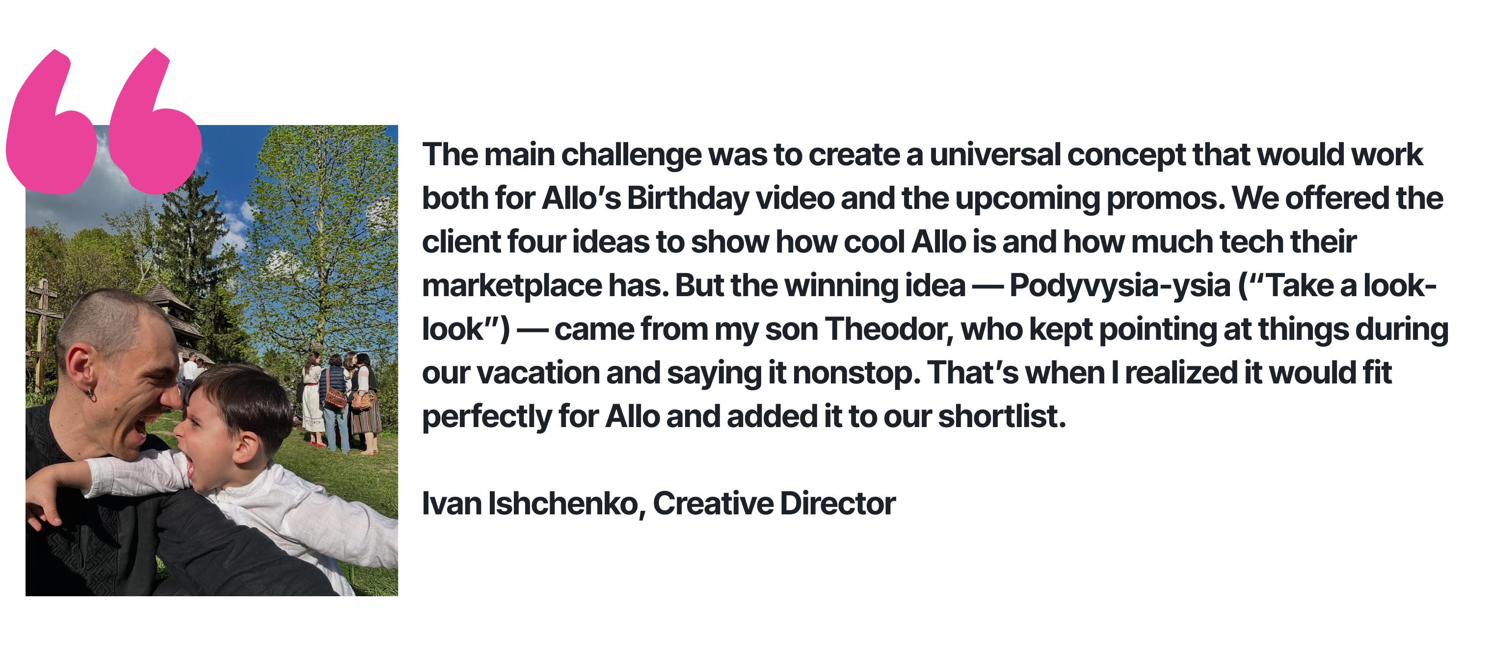 We initially had several detailed concepts for how the video could unfold. But once the client chose the “Podyvysia-ysia” (“Take a look-look”) idea, we moved forward with it. We decided to make the video in a recitative style. That’s how we came up with smartphones-ones, tablets-lets, and lots of other gadgets-ets featured in the Allo marketplace. The echo effect perfectly enhanced the impression of this variety.