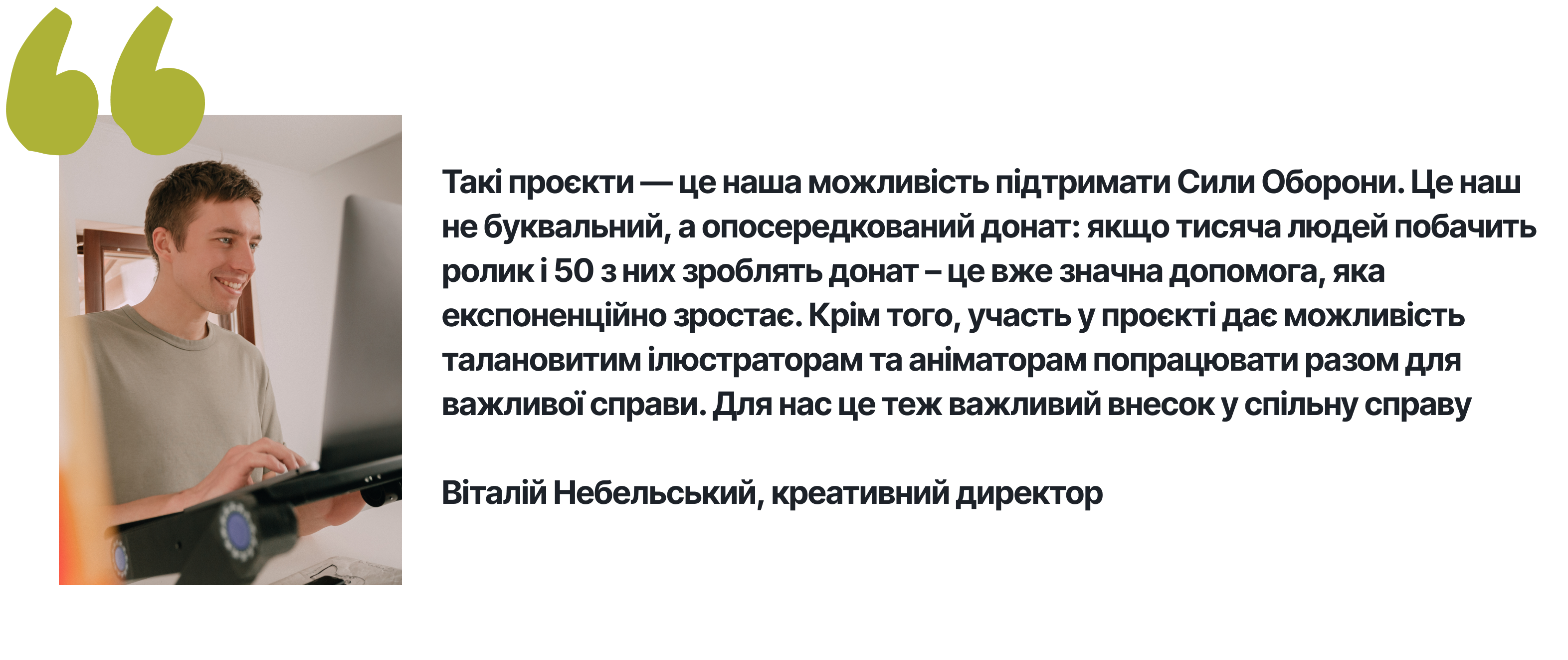 Для створення цього проєкту ми залучили усю нашу анімаційну команду. Між ілюстраторами та аніматорами були розподілені усі необхідні сцени та ілюстрації, а дзвінки-синхрони відбувались щодня.